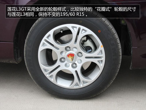 莲花L3GT选用全新的轮毂款式,比较共同的“花瓣式”,多幅的铝合金轮毂与车身非常的搭调,时髦、动感的气质天然流露。轮毂的尺度与莲花L3相同,坚持不变的195/60 R15 。这款轮胎的长处是比较耐磨,正好合适L3 GT这种主打控制、重视驾驭感触的车型。